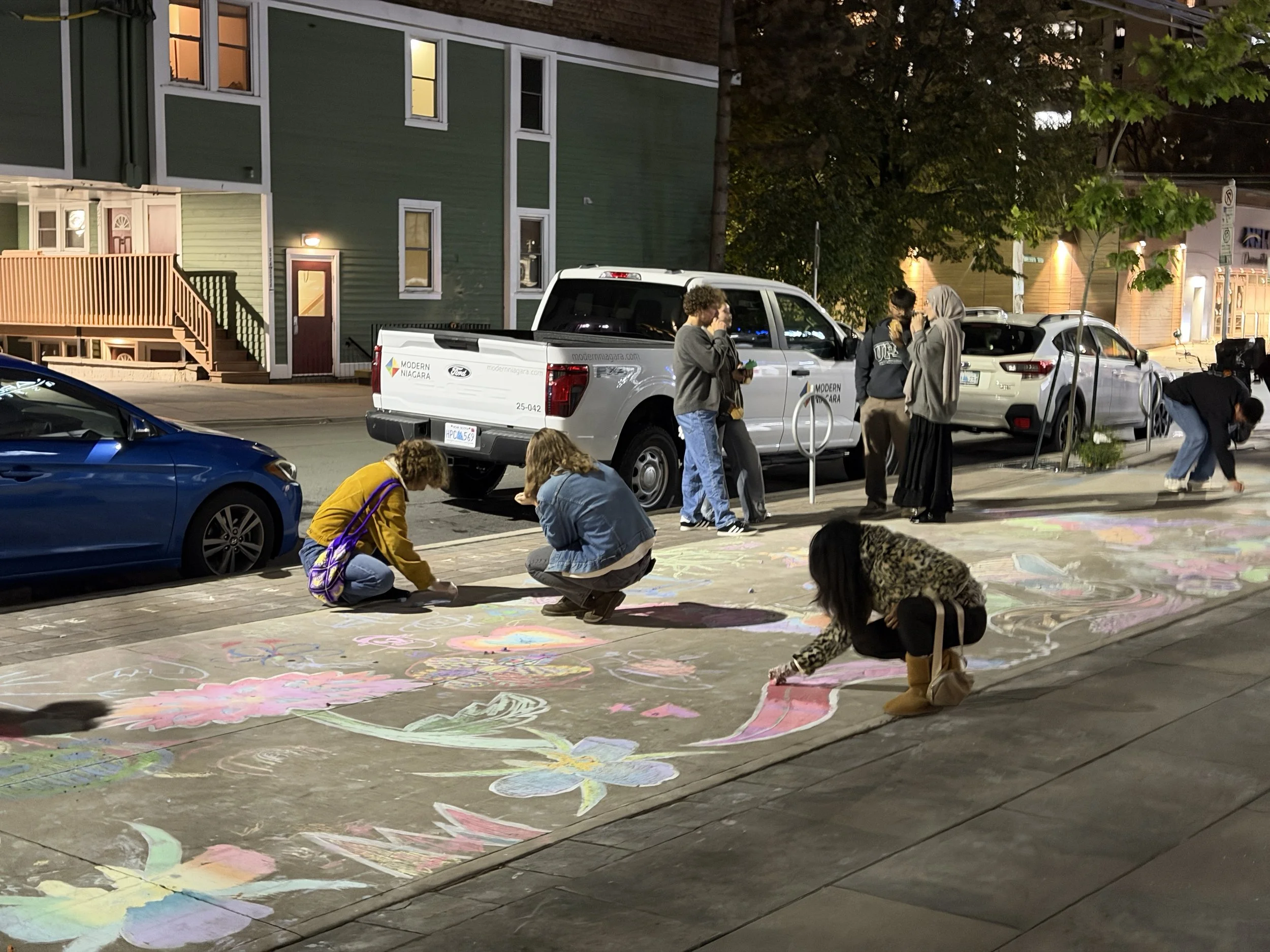 "Drawn To It" was an idea to do temporary sidewalk drawings and have folks colour it in with chalk---but this project ended up being so much more than that. About 200+ folks took part, joyfully colouring in spaces and making their own drawings of foxes, flowers, spaceships, bees and butterflies bringing the sidewalk to electric life. While I was painting the block-length sidewalk in advance of the event, many folks stopped to ask questions, comment on how nice it made the space (and little ones got VERY excited hearing they would be colouring it in themselves). While I made, planned and carried out the framework for this project, it’s really the folks of Halifax who took part and made this lovely mural.