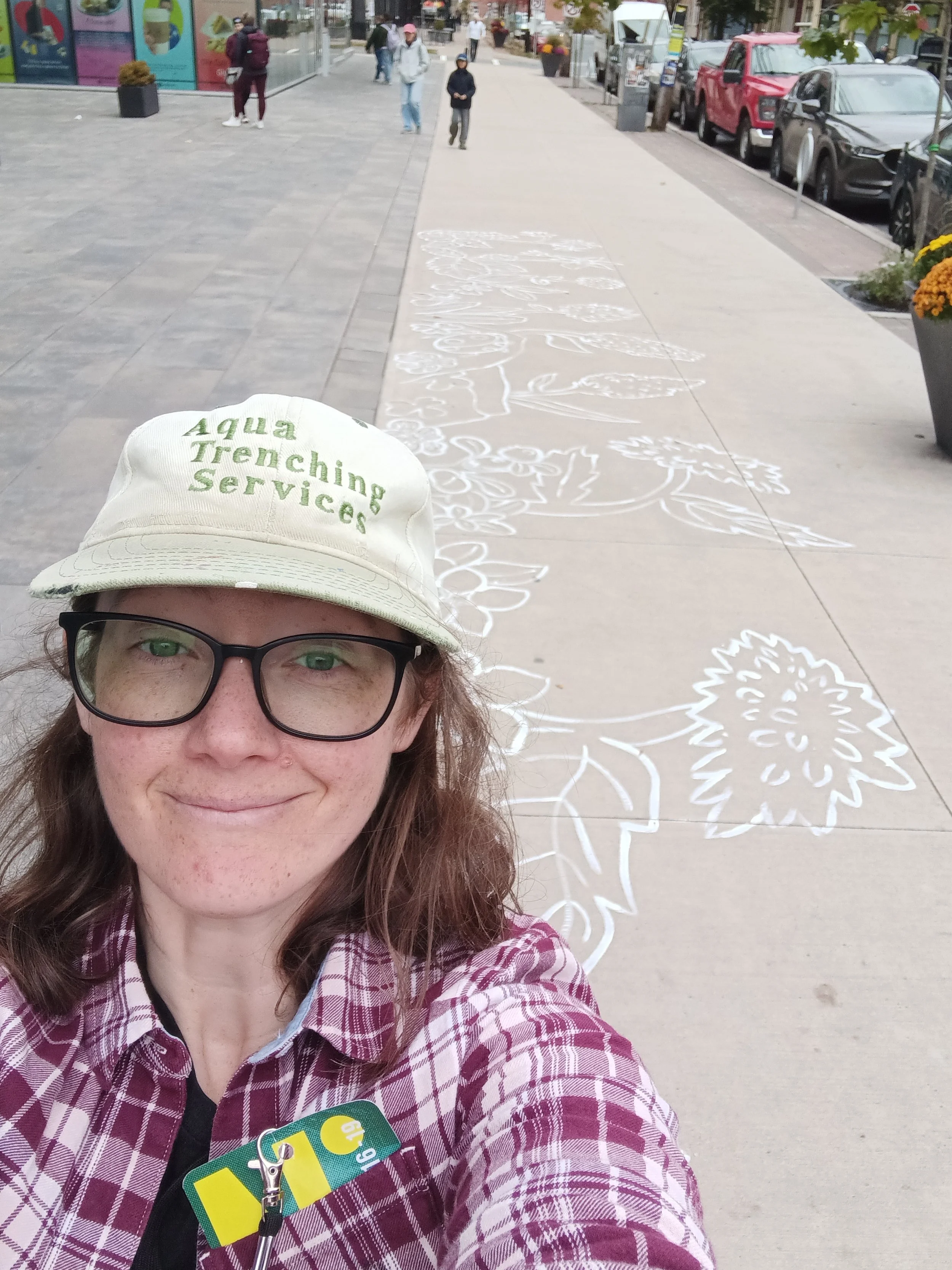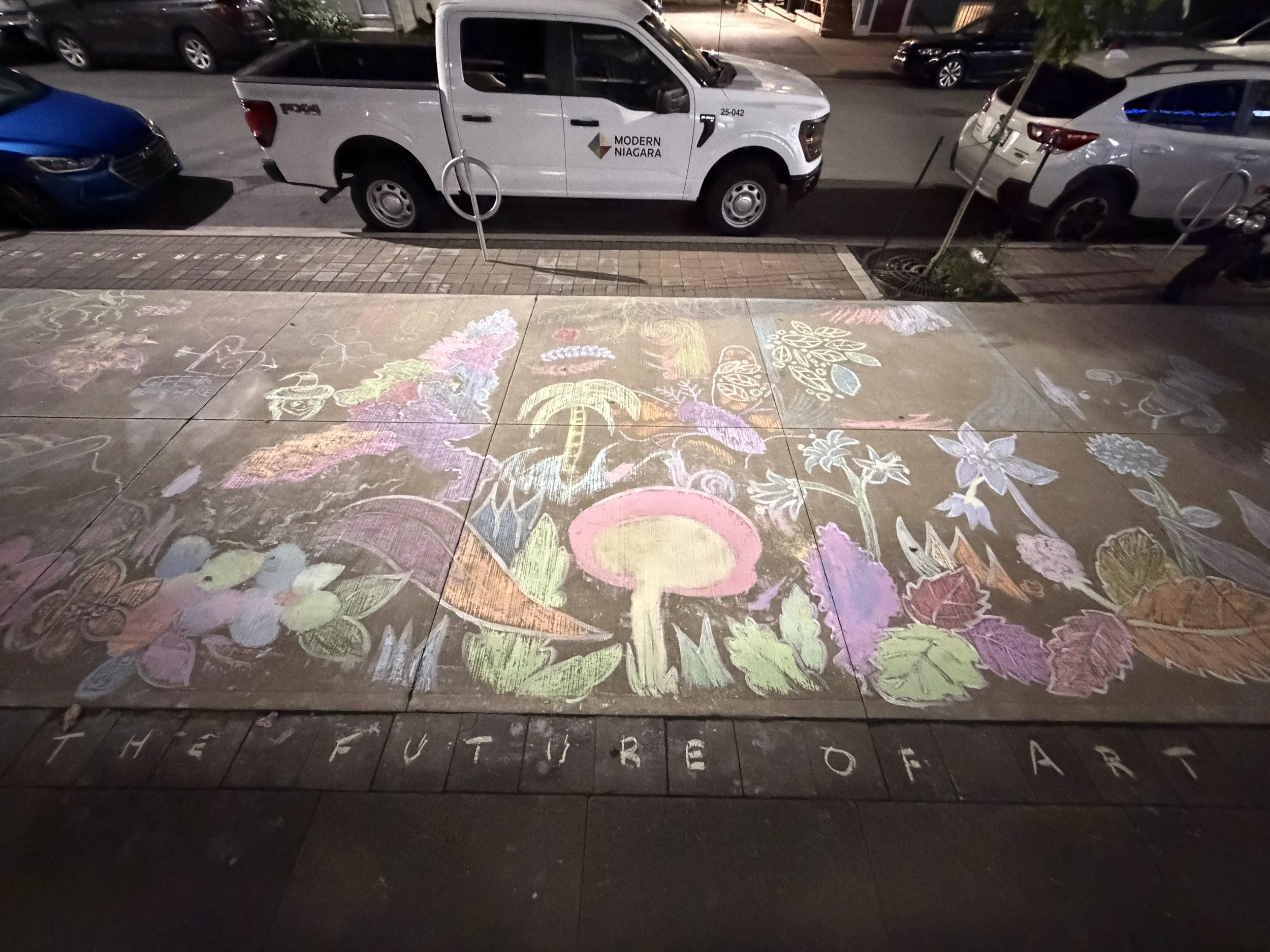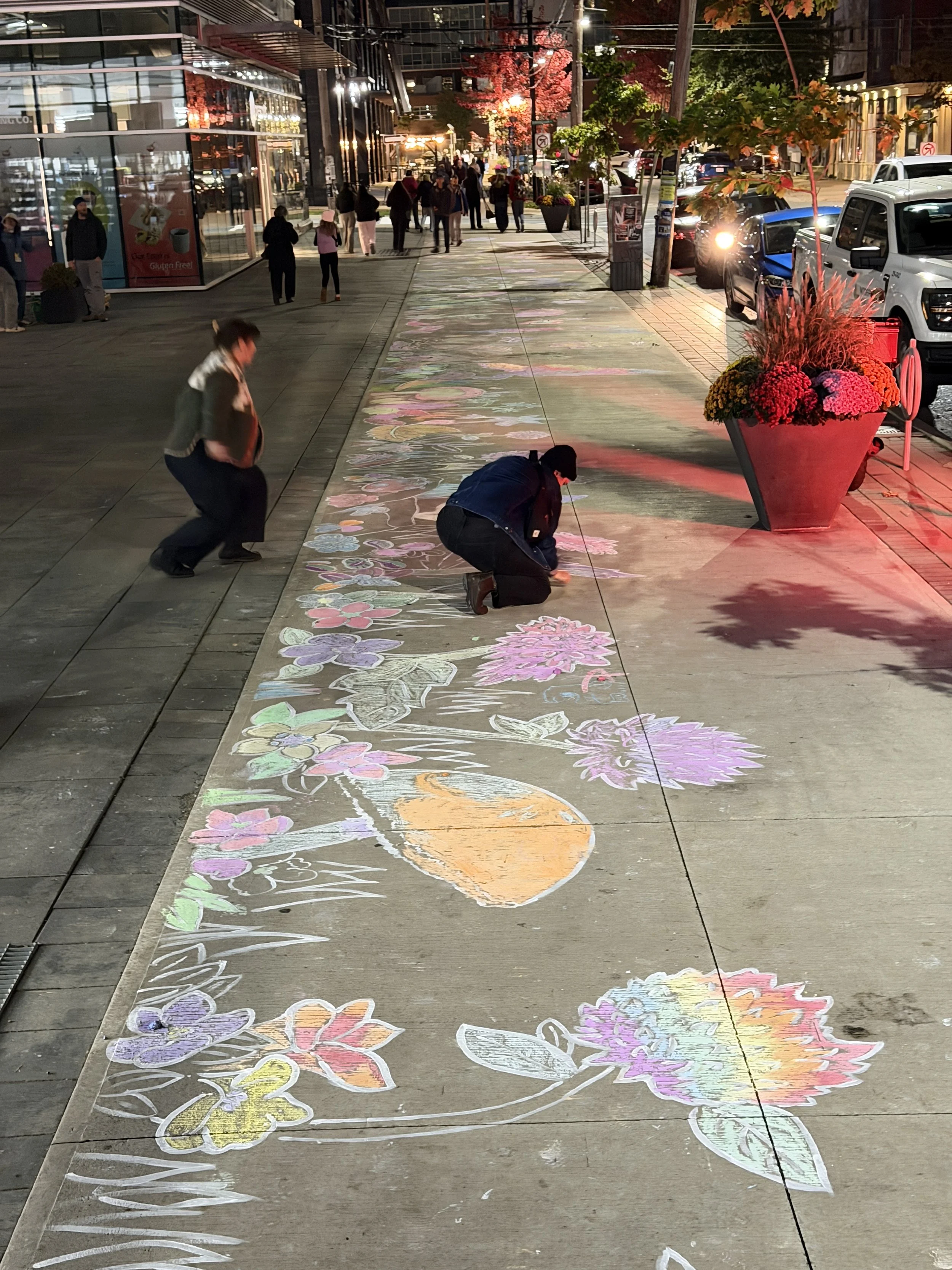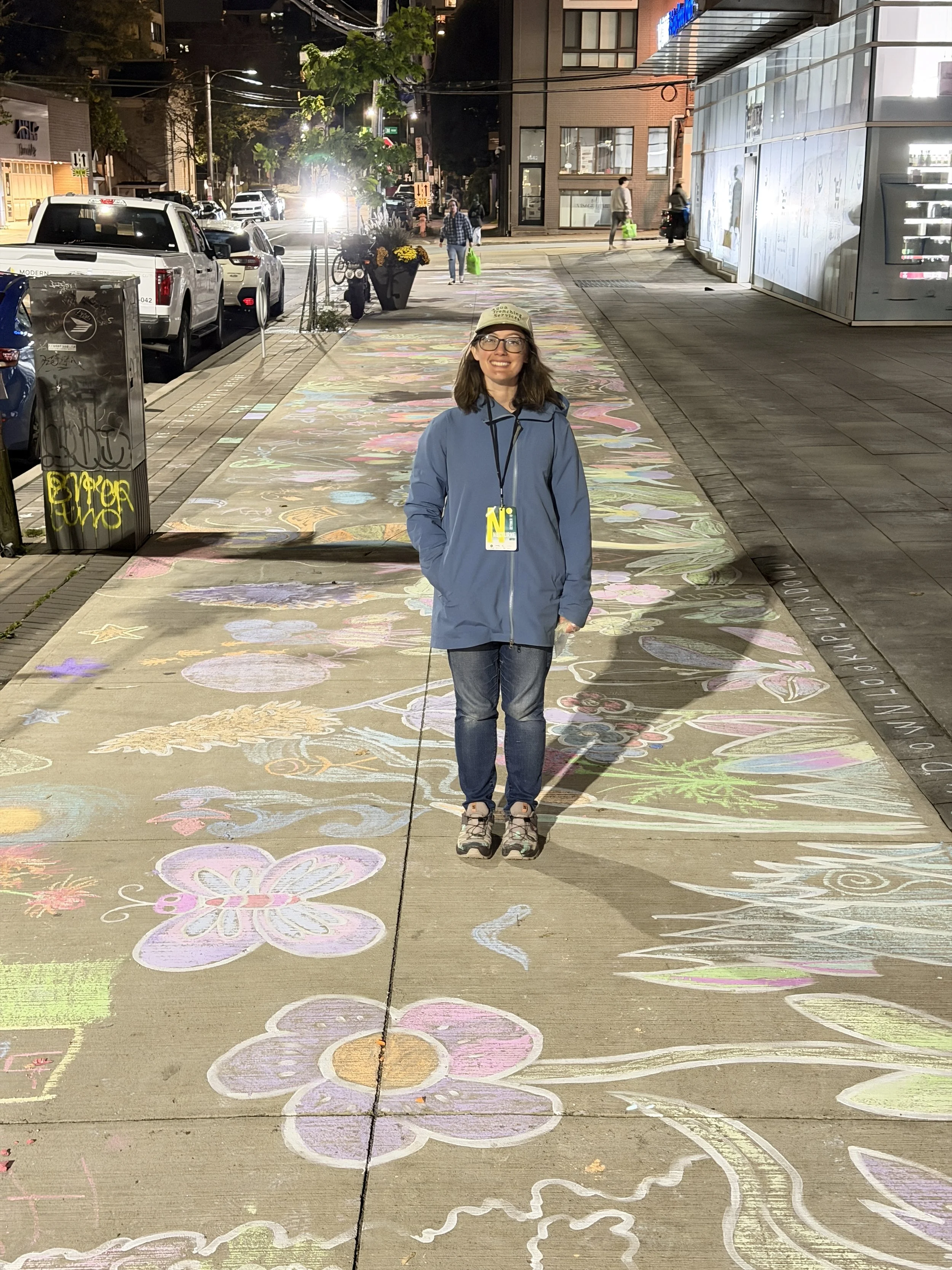 In 2025, my community proposal was chosen as a featured Beacon Project during Halifax’s Nocturne Art At Night festival. Based on the event’s theme of “ground”, I created a giant temporary mural of the world at ground level. Painting linework of recognizable plants and insects on a large scale, particiants were invited to help colour it in and make their mark on the city with hand-made chalks (which I also ground up to make).